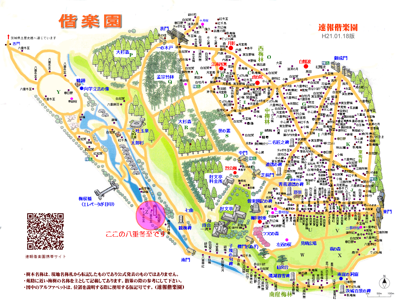 場所:南門と梅桜橋の中間に「偕楽園」と書かれた標柱があります。その左手の白梅(八重冬至)です。