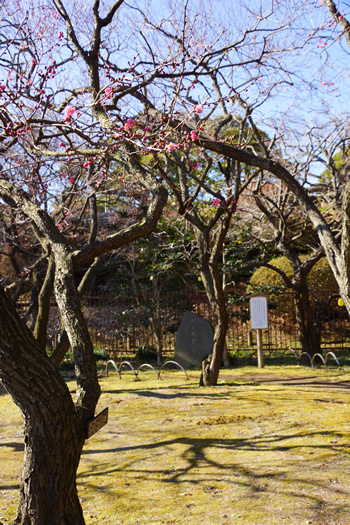 青空に紅梅が映えます。この左手奥に偕楽園記の碑があります。